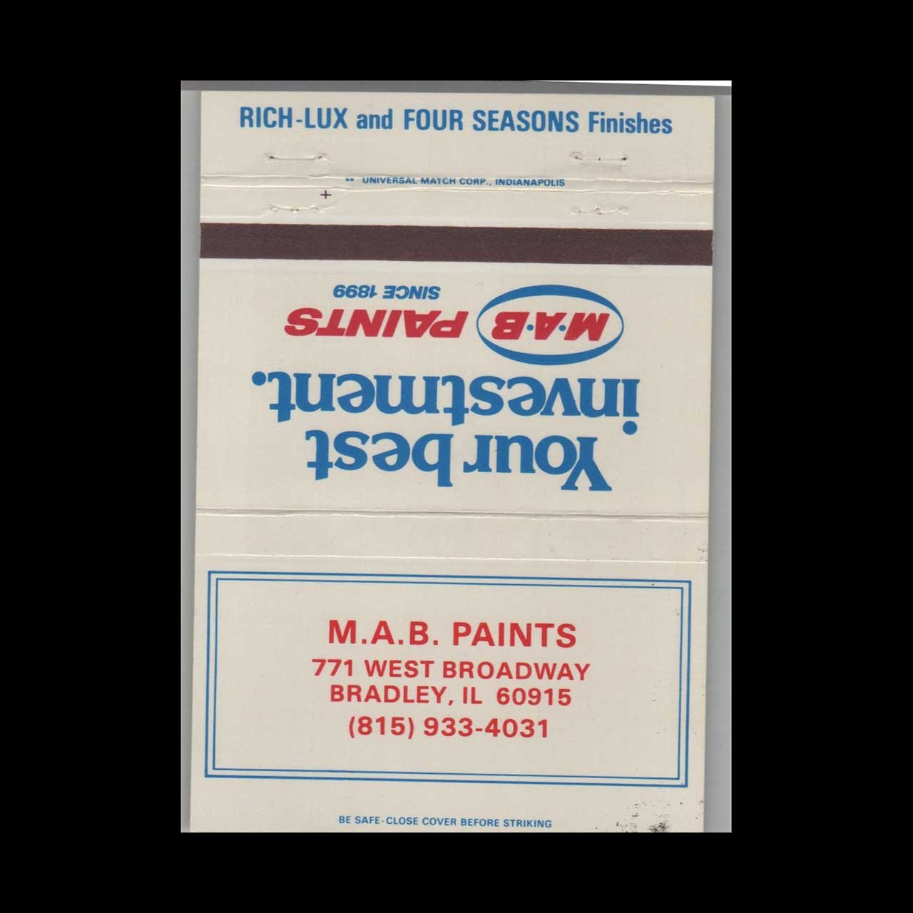 Vintage M.A.B. Paints Matchbook Cover – Bradley IL Classic Advertising Art
